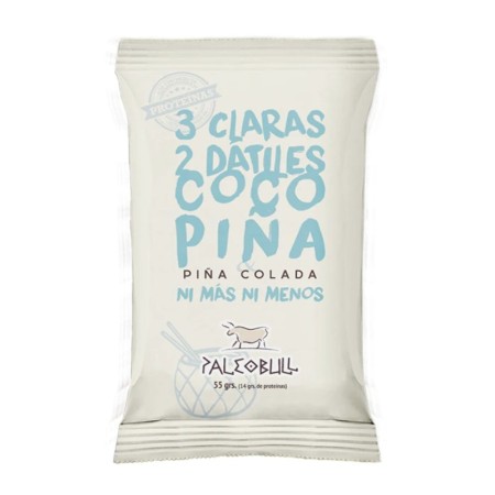 Pack de 15 barritas energéticas de piña colada con alto contenido en proteínas (14 g). Solo ingredientes naturales: dátiles (48%), clara de huevo deshidratada (26%), coco (14%), piña deshidratada (8%), limón deshidratado, aceite de oliva virgen extra y aroma natural.