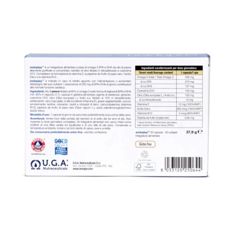 Contenido por dosis: Omega-3: 456 mg (de los cuales EPA: 275 mg; DHA: 137 mg); Coenzima Q10: 100 mg; olivo (Olea europaea L.) fruto e.s: 110 mg (del cual hidroxitirosol: 10 mg); vitamina E: 12 mg (100 % VRN*); ácido fólico: 300 μg (150 % VRN*); vitamina B12: 2 μg (80 % VRN*); piperina del fruto de pimienta negra: 0,85 mg. *VRN: Valor de Referencia de Nutrientes.
