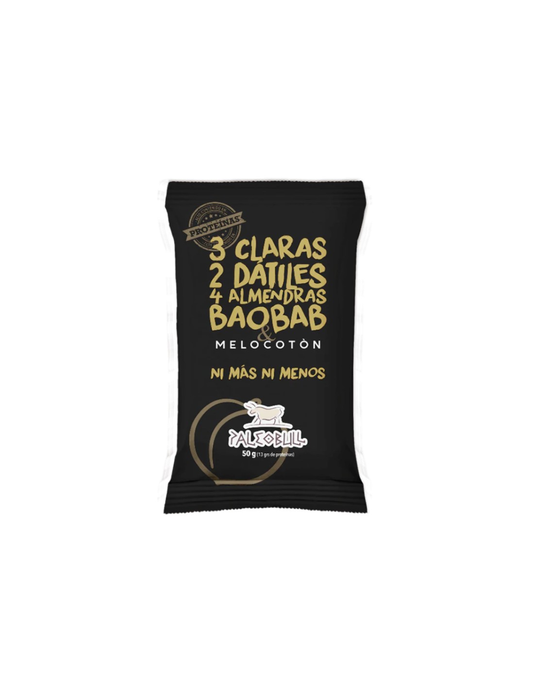 Barrita energética de melocotón y baobab con alto contenido en proteínas (13 g). Solo ingredientes naturales: dátiles (50 %), clara de huevo deshidratada (25 %), melocotón (9 %), almendra (7 %), coco (6 %), baobab (2 %), aroma natural de melocotón. Esta barrita es 100% recomendada para la dieta paleo.