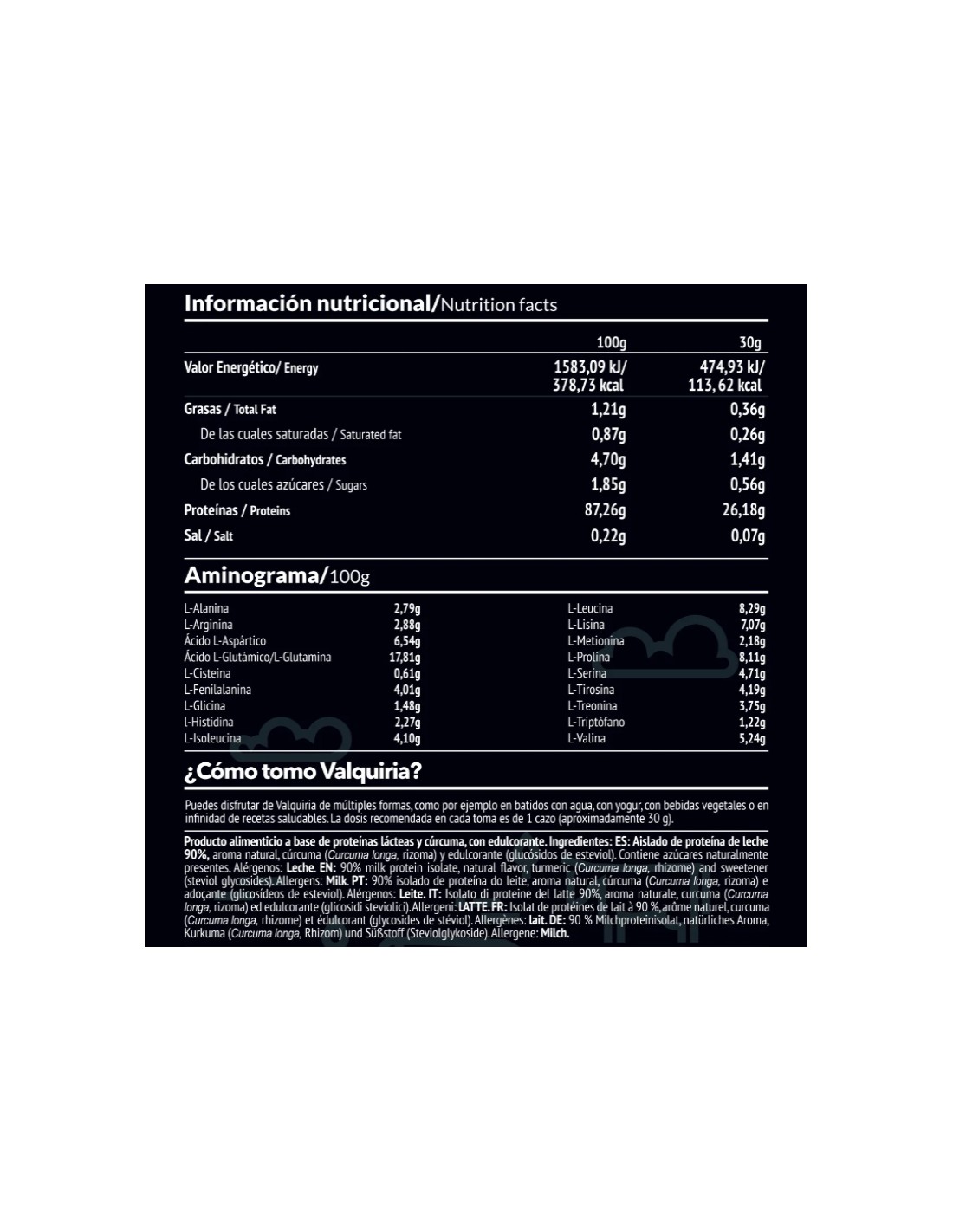 Valquiria es un complemento alimenticio elaborado a partir de aislado de proteína de leche de vacas gallegas criadas en granjas extensivas. Con aromas naturales, sin aditivos artificiales y edulcorada con estevia (excepto el sabor neutro).